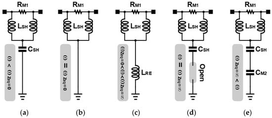 Equivalent circuits for pass mode according to frequency: (a) ω < ωZEQ = 0, (b) ω = ωZEQ = 0, (c) ωZEQ = 0 < ω < ωZEQ = ∞, (d) ω = ωZEQ = ∞, and (e) ωZEQ = ∞ < ω.