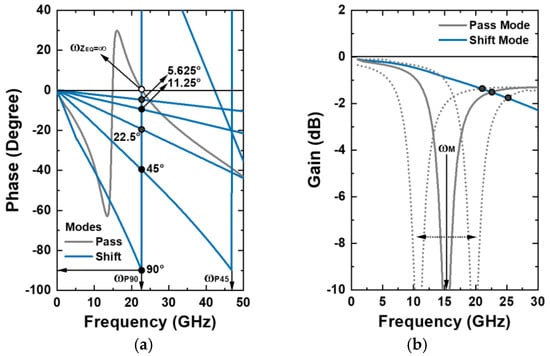 Here, ωP represents the frequency at which the phase of the output signal compared to the input signal changes to 90°, assuming that RM2 is sufficiently small in the shift mode of Figure 1b and the impedance by LRE is ignored. In this study, in order to make the phase of the pass mode close to zero, ZEQ is designed to be ∞ at the operating frequency. At this time, when the value of ωP is adjusted through LSH and CSH, the slope of Equation (3) is also adjusted. Accordingly, as shown in Figure 3a, a desired phase in the shift mode can be secured at a given operating frequency. In Figure 3a, ωP90 and ωP45 are shown as examples. Here, ωP90 and ωP45 are ωP values for phase shift of 90° and 45° at a given operating frequency, respectively. As a result, through this process, values of ωZEQ=∞ and ωP are set.