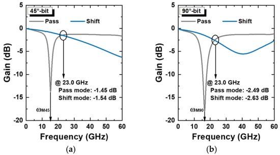 Figure 4 shows the simulated phases for the shift and pass modes in the 45° and 90° bits. In this study, the values of ωP for 45° and 90° bits were designed to be 41.5 GHz and 23.4 GHz, respectively. Here, ωP45 and ωP90 present the values of ωP for 45° and 90° bits, respectively. As shown in Figure 4, simulation results of high-accuracy phase shift were obtained for both 45° and 90° bits.