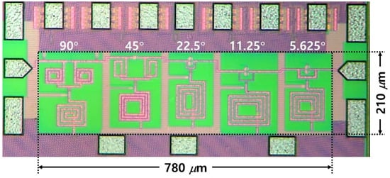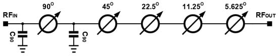 Figure 6 shows the configuration of the designed phase shifter, and each bit is designed with the schematic of the unit-bit of Figure 1. C90 with 56.3 fF is additionally used for matching between bits. Although 180° bit is not mounted on the designed phase shifter of this study, the 180° bit can be easily implemented by connecting two 90° bits designed in this study if a 180° bit is required.
