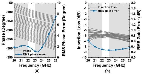 Figure 9 shows the measured phase and gain characteristics. In the frequency range of 22.0 GHz to 23.0 GHz, insertion loss, RMS phase error, and RMS gain error were measured as 7.44 ± 2.0 dB, <2.6°, and <1.2 dB, respectively. Compared to the simulation results, in the measurement results, insertion loss increased and RMS phase and gain errors were somewhat degraded. The main reason expected is that the accuracy of EM simulation in the design process of the 90° bit seems to have deteriorated. If the EM simulation accuracy for the 90° bit is improved, it is expected that RMS phase and gain errors can be improved. Accordingly, it is also expected that the measurement results of the phase shifter with a wider operating frequency range can be obtained.