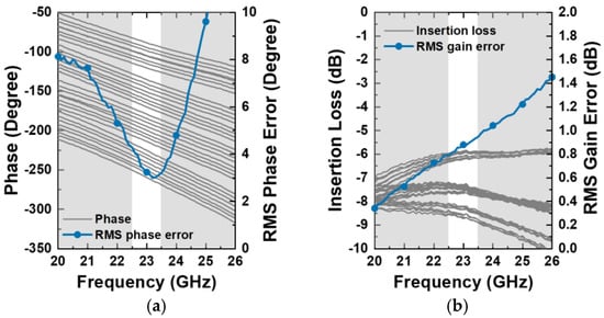 Measurement results: (a) phase and RMS phase error and (b) insertion loss and RMS gain error.