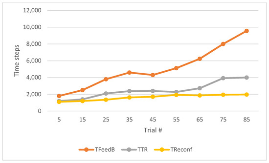 The results are shown in Figure 7 in terms of the results of tFeedB, TRR, and tReconf robots vs. the percentage of unreliable robots P.