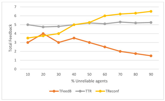 6.4. Variation of Total Feedback versus Percentage of Unreliable Robots