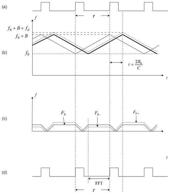 In Figure 1a, we illustrate the time duration of modulation in both the positive and negative directions. Figure 1b shows the transmitted frequencies represented by solid lines, while the thicker solid lines indicate the received echo frequencies. The received echo frequencies with the Doppler effect are depicted as dashed lines. However, it is important to note that this paper assumes the neglect of the Doppler effect in its analysis. The difference between the transmitted and echo frequencies, known as the beat frequency , is illustrated in Figure 1c, where the solid line represents the frequency difference for stationary targets and the dashed line represents the frequency difference for moving targets. Figure 1d shows the frequency sweeping time duration of the signal, with the computation time of the FFT being shorter than the sweeping time duration [33,34,35]. The variables in Figure 1 are explained as follows:
