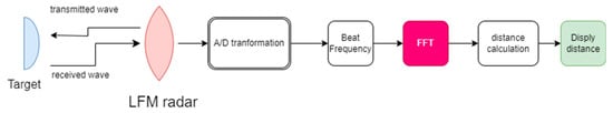 Among them, the LFM (Linear Frequency Modulated) radar is also named the linear frequency-modulated continuous wave (LFMCW) radar. The LFMCW radar utilizes a continuous wave signal with linearly varying frequencies over a certain time duration. Therefore, the name LFMCW radar primarily describes its characteristics of using continuous wave signals and frequency modulation to measure the distance, velocity, and direction of target objects. The transmitted signal is typically a frequency-modulated signal called a “chirp signal”. When this chirp signal is emitted towards a target and reflected back, the receiver receives an echo signal relative to the transmitted signal. As the target object and the environment scatter and reflect the signal, the received echo signal contains information about the target’s distance and velocity. By analyzing the frequency changes and delays of the received signal, the distance and velocity of the target object can be calculated [4,5]. It is mainly applied in 1. Autonomous vehicles: LFMCW radar is used in vehicle sensing systems to achieve functions such as obstacle detection, distance measurement, and vehicle position tracking [6,7,8,9,10]; 2. Drones and unmanned aerial vehicles: LFMCW radar can be used for obstacle detection, collision avoidance, and terrain mapping in unmanned aerial vehicles to enhance flight safety and navigation capabilities [11,12,13,14,15]; 3. Defense systems: LFMCW radar is used for target detection and tracking in military and defense applications, such as target identification, missile defense, and surveillance systems [16,17,18,19,20]; 4. Industrial applications: LFMCW radar can be used for distance measurement, displacement detection, object identification, and motion tracking in industrial settings for automation control and robotics applications [21,22,23,24].