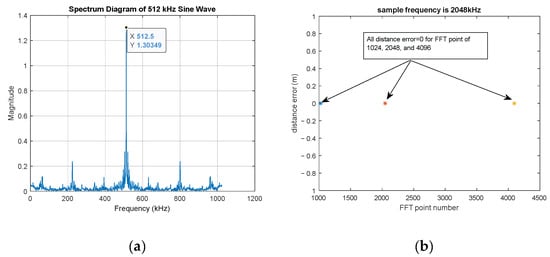 FFT stands for ‘Fast Fourier Transform,’ an efficient algorithm used to compute the Discrete Fourier Transform (DFT) and its inverse. In this paper, FFT is utilized to identify the different ranges of targets. It finds extensive use in signal processing, image processing, audio processing, communication systems, and various scientific and engineering domains. Figure 3a depicts the spectrum diagram obtained using the ‘fft’ command in MATLAB for a 512 kHz signal with 1024 points of FFT. The plot displays a single peak at 512 kHz, representing the frequency of the sine wave, without any additional alias peaks. For our specific application, we used an LFM radar to calculate distances. After performing simulations with a sampling frequency of 2048 kHz for a 512 kHz signal, we utilized FFT with point sizes of 1024, 2048, and 4096. The FFT point number of 1024 was chosen for implementation to minimize hardware and computational consumption while still achieving accurate results. The distances calculated using FFT point size 1024 showed no errors, as shown in Figure 3b, demonstrating the effectiveness of the chosen configuration for our radar system.