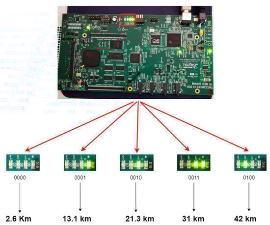 When the distance is between 10 and 20 km, the value is 0001. When the distance is between 20 and 30 km, the value is 0010. When the distance is between 30 and 40 km, the value is 0011. When the distance is above 40 km, the value is 0100. The precise distance values are obtained by reading the values from memory and interpreting them on a computer. This is achieved using MATLAB’s real-time data exchange (RTDX) via built-in blocks to transmit the results of hardware execution back to the host computer via USB. The RTDX blocks do not have an effect during the simulation stage and only become active after downloading the machine code to the target board using CCS. The steps involve adding the “To RTDX” block to the Simulink model, compiling and downloading the code, activating the RTDX channel, and establishing communication between the computer and the target board. The experimental results are shown in Figure 8. These five subfigures all contain LEDs and were zoomed in from the photo of the DSK 6713 board. This demonstrates that the LEDs are lit up, and the numbers displayed on the screen correspond to measured distances of 42 km, 31 km, 21.3 km, 13.1 km, and 2.6 km. These results indicate that the developed algorithm was successfully downloaded to the board’s SDRAM and then executed viathe CPLD to drive the LEDs, performing the correct actions.
