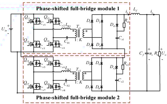 With the continuous development of DC converters, phase-shifted full-bridge converters are widely used in medium- and high-power supply applications due to their simple structure and high efficiency, and have gradually become the mainstream topology. When the output side is required to be medium and high voltage, multiple phase-shifted full-bridge topologies can be connected via input parallel and output series (IPOS) to form an IPOS phase-shifted full-bridge converter to achieve a higher boost ratio. In recent years, with the development of new energy vehicles, aerospace, shipbuilding, and other fields, high-power DC power supply has been widely used [1]. At the same time, the application of high-power DC equipment has led to a further increase in the scale of the DC power supply system, and the power level that the DC converter needs to transmit is also growing higher and higher. A single converter is difficult to support higher transmission power, and multiple converter modules need to be used in parallel for power transmission [2].
