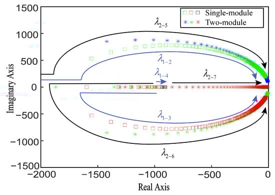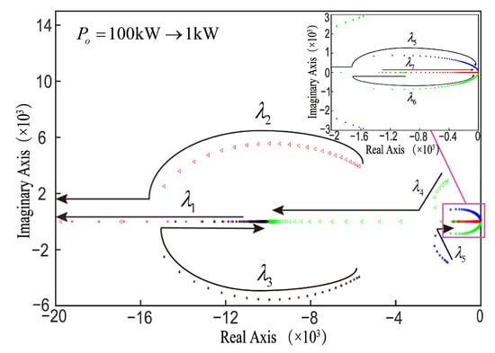 Taking the two-module paralleled IPOS phase-shifted full-bridge converters system as the object, the influence of load power change on the stability of the system is first studied. The load power is reduced from 100 kW to 1 kW, and the eigenvalue trajectory is shown in Figure 6.