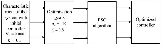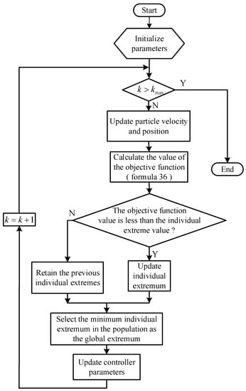 According to (36), combined with the PSO algorithm, the control parameters of the eight-module paralleled IPOS phase-shifted full-bridge converters system are optimized. For the PSO algorithm, the position of the particle represents the parameters of the controller, the speed of the particle represents the adjustment of the controller parameters, and the fitness value of the particle represents the objective function value. In this algorithm, the position of the particle corresponding to the global extremum is the final optimal control parameter value. The block diagram of the optimized controller is shown in Figure 8, and the specific algorithm flow is shown in Figure 9.