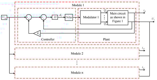 The n-module paralleled IPOS phase-shifted full-bridge converters system is composed of n IPOS phase-shifted full-bridge converters with the same parameters, which are connected via input parallel and output parallel, as shown in Figure 2. When the output is in parallel, the capacitors of each converter are in parallel, and the capacitor voltage is equal to the output voltage, namely . Therefore, the capacitor voltage disturbance of each converter can be coupled into the voltage disturbance of a parallel equivalent capacitor, denoted as . According to the single machine derivation, each converter can select three state variables , , and as the state variables of the whole parallel system model. Therefore, n parallel systems take the state variables as follows:
