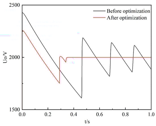 For the optimization of the control parameters, Figure 13 shows the output voltage simulation waveforms of the eight-module paralleled IPOS phase-shifted full-bridge converters system with the control parameters before and after optimization under the load power is 1 kW and , respectively. Compared with the output voltage waveform before optimization, the optimized output voltage oscillation attenuation is significantly accelerated, the damping ratio is significantly increased, and the system stability is significantly improved. The proposed control parameter optimization method of the eight-module paralleled IPOS phase-shifted full-bridge converters system has a significant effect, which verifies the feasibility of improving the stability of the system by optimizing the parameters instead of the output side parallel dead load under light load.
