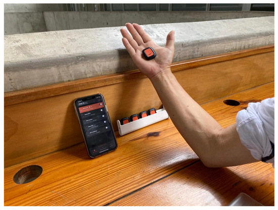 The IMUs applied in this work contain MEMS-type gyroscopes, accelerometers, and magnetometers. These individual sensor signals are fused through a statistical estimation framework to obtain three-dimensional (3D) limb and joint orientation. The output provided by the three main device components is then fed into the signal processing pipeline. The two main algorithms noted above are run onboard the motion tracking sensor [14]. The sensors are primarily designed to connect to mobile devices such as smartphones that must be BLE-capable (Figure 1). The wearable device proposed for use in experiments integrates smart sensors to track a user’s physical behavior, specifically the gyration and orientation of their hand, in high spatial and temporal resolution. This enables real-time multi-parameter tracking as a significant wearable sensor system [15].