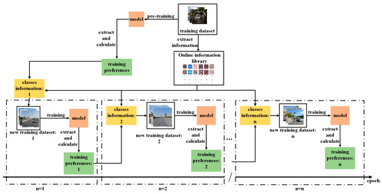 The MSACP training process is shown in Figure 1. First, there are two key pre-processing steps. The first pre-processing is to build an online database of class information. This library was built to reduce the time spent on each training dataset update and to simplify the process of updating the training dataset. The online class information database contains the information of all the classes in the training dataset. The semantic information of these classes is collected and classified by label files. When the training dataset needs to be updated, the MSACP algorithm only needs to extract the corresponding information from the online class information library. The first update of the training dataset is based on the evaluation results of the pre-training. The model begins formal training using the training dataset. In formal training, the MSACP algorithm divides the training amount of the model into n training stages according to the hyper-parameter n.