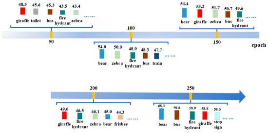 To provide an intuitive explanation of the above analysis, the model YOLOv3 was trained with the original COCO datasets. Figure 2 shows the evaluation results of these 5 nodes. The figure only shows the top 5 categories with the highest values. These 5 nodes are the 50th, 100th, 150th, 200th, and 250th epoch, respectively. From the figure, it can be seen that the evaluation results of the 200th epoch show a significant decrease compared to the results of the 100th and 150th epoch, and the training of the model is unstable. For the top five classes, there are differences in the evaluation results between the five epochs. The class giraffe is highest at epoch 50, but does not appear in the top five highest classes at epoch 100. The class bear does not appear in the 50th epoch, but appears in the next four extracts. The class bus does not appear in the top five highest epochs at the 200th epoch, but appears in the other four extractions. The four classes of toilet, train, frisbee, and stop sign appear only once in these five extractions.