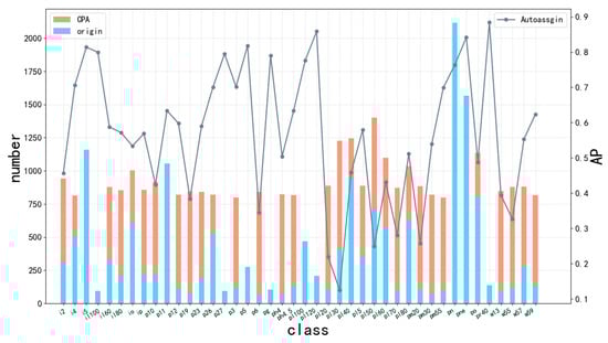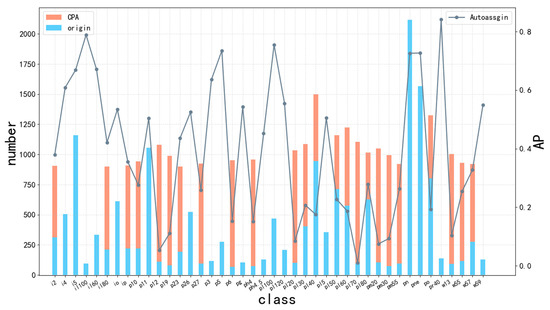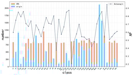 To analyze the experimental phenomenon in detail, the experimental results of AutoAssign are visually analyzed. The number of expanded samples after CPA optimization and the evaluation results of each class are shown in Figure 3. The horizontal coordinate is the class of the TT100K dataset. The hyper-parameters e and T in the CPA algorithm are set to 2.5 and 0.05, respectively. It can be seen from Figure 3 that 15 classes in the TT100K dataset are not amplified by the CPA algorithm. This is due to the fact that each of these classes has a high AP or contains a very large sample size. Other classes are amplified because they contain less information in the training dataset and their APs are not ideal.