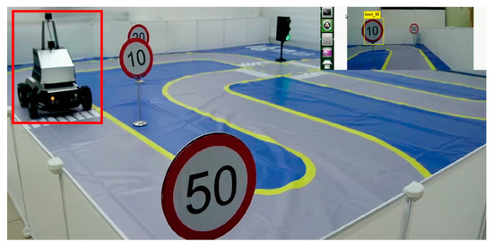 Many deep learning algorithms have been applied in real life, but there are also many challenges in the practical application. How to improve the performance of the embedded platform under the limited computing power is one of the main challenges. Therefore, MSACP is applied to the autonomous driving scenario to test the effect of the algorithm in practical applications. The scenario is shown in Figure 7. It can be seen that the autonomous driving scenario has multiple speed limit signs and a traffic light. The embedded platform is in the red box, which is equipped with a CPU of 4-core ARM Cortex-57 series (ARM, Cambridge, UK) and a GPU of 128-core Maxwell architecture (NVIDIA, Santa Clara, CA, USA). The computing power is not less than 472 GFLOPs. In addition, the platform is equipped with a human–computer interaction interface, which can output the road condition information and detect the corresponding object information in real time.