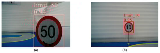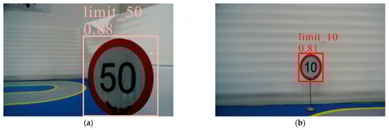 The detection effect of YOLOv3-tiny: (a) The class of speed limit 50 km/h; (b) The class of speed limit 10 km/h.
