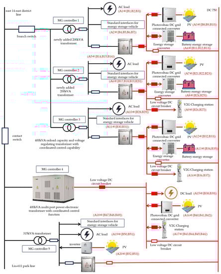 Furthermore, each microgrid internally possesses photovoltaics, energy storage, V2G, AC loads, and DC loads. Each microgrid is equipped with an independent microgrid controller, enabling each microgrid to coordinate with the cloud master station for optimized power management and dispatching. The system is also equipped with section switches on the AC bus, aimed at preventing the impact of a single microgrid failure on other microgrids. Circuit breakers are installed on both the AC and DC sides within the microgrids to similarly prevent the impact of single microgrid failures on others.