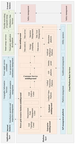 The cloud platform consists of the application layer and the platform layer, as shown in Figure 3. The platform layer should include cloud platform basic services, an IoT management platform, and an enterprise middle platform. The enterprise middle platforms related to the power IoT should include a technical middle platform, data middle platform, power grid resource business middle platform, and so on. The application layer should be built upon the data and basic component services provided by the platform layer, enabling support for internal and external business. The cloud platform should adhere to the principles of openness and sharing. It should unify access to data from edge and end devices through the communication network and utilize cloud–edge collaboration mechanisms to achieve unified management of large-scale IoT infrastructure and efficient processing of massive sensory information. The cloud platform should have functions such as massive terminal coupling, PnP devices, diverse data integration, flexible system deployment, elastic resource telescoping, application data decoupling, rapid application deployment, and cloud–edge collaboration. These functions should meet the requirements of rapid response to distribution network business needs, elastic application scalability, dynamic resource allocation, intensive system operation and maintenance, and so on.