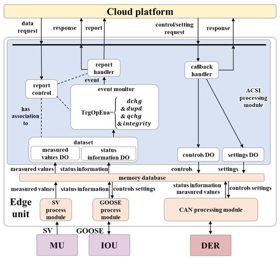 Edge devices are the carriers for implementing edge computing functions in the power distribution IoT. With “cloud–edge collaboration” and “edge intelligence” as their core features, they serve as open platforms for data aggregation, computation, and application integration. Edge devices collaborate with end devices to exchange data. They have the capability for local data analysis and on-site processing, enabling comprehensive data collection and perception in power distribution applications. Edge devices collaborate with cloud platforms to exchange data, reducing the communication network and cloud platform’s burden in terms of information transmission and processing. They should also support edge-to-edge interactions. The design concept for edge devices should be based on “hardware platformization” and “software APP-ization”, enabling virtual deployment and mutual isolation of functionalities. Please refer to Figure 4 for the functional architecture of edge devices.