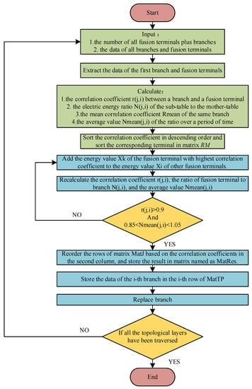 - Store the data of the i-th branch in the i-th row of MatTP, where MatTP is the topological matrix that we have derived, where the first column represents the topological hierarchy, the second column represents the branch number, the third column represents the number of fusion terminals in the branch, the fourth column represents the correlation coefficients, the fifth column represents the ratio, and starting from the sixth column, the subfusion terminal indices are recorded, which are the same as the first row of MatRes.