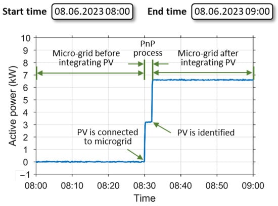 During the operation of the microgrid, distributed energy resources may be put into operation or shut down frequently according to the description in Section 3.2. The active power monitoring curves before and after PV integration into the microgrid test platform are presented in Figure 9. The “microgrid test platform” is a theoretical simulation environment specifically designed for our research. It does not directly correspond to the physical implementation of the Jingshan Microgrid Project described in Section 2.1 but serves as a powerful tool to test our algorithms and strategies. Within this simulation framework, we replicate the characteristics and behaviors of a microgrid, including its components, load profiles, intermittent renewable energy sources, communication infrastructure, and other relevant factors. By doing so, we can evaluate the integration of new components, the adaptability of our plug and play mechanisms, and the accuracy of our topology identification approach [,].