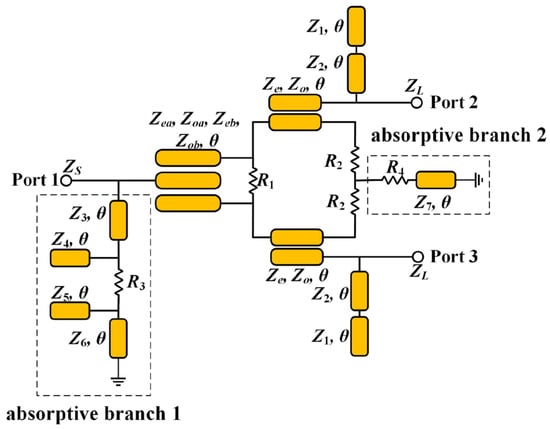 In the following, the circuit parameters of the proposed AFPD are introduced in detail. Firstly, the electrical lengths of the lines in Figure 1 are all defined as θ and correspond to 90° at the center frequency. Let Ze be the even-mode impedance of the CL, and let Zo be the odd-mode impedances of the CL. Since the TCL is composed of CLs with unequal widths, asymmetric CLs are utilized for the analysis of the TCL. Here, four parameters (Zea, Zoa, Zeb and Zob) are applied for the expression of the couplings between the edge and center lines. In detail, Zea and Zoa are the impedances of the edge line under even- and odd-mode excitations, respectively, while Zeb and Zob denote the impedances of the center line under even- and odd-mode cases, separately. The stepped open-circuited stub consists of two kinds of transmission lines (TLs) with the characteristic impedances of Z1 and Z2. The isolation resistor named as R1 is shunted between the nonadjacent lines of the TCL. Two isolation resistors, R2, are in series between the terminals of the two CLs. In the absorptive branch, the first L-shaped structure includes a TL (Z3) and an open-circuited stub (Z4), while the other L-shaped structure is composed of an open-circuited stub (Z5) and a short-circuited stub (Z6). For the other absorptive branch, the characteristic impedance of the short-circuited stub is defined as Z7.