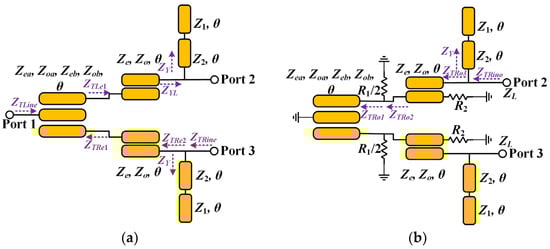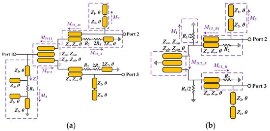 Here, the MA, MTCL, MCL_A and MY represent the ABCD matrices of the absorptive branch at the input port, the TCL, the CL with absorptive branch, and the stepped open-circuited stub, respectively, when input from port 1. And Equation (A2) gives the detailed ABCD expressions of MA, MTCL, MCL_A and MY.