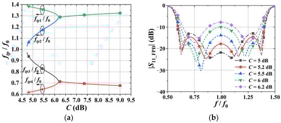 According to (7)–(9), the TPs varies along with different circuit parameters and are investigated when the IR is set as 0.6. Figure 4a shows the variations with the coupling C of the CL, where C = (Ze − Zo)/(Ze + Zo). It is seen that there are four TPs between the two TZs when C is within 4.708–6.2 dB. Out of the range, the TPs are reduced to two. Figure 4b gives the detailed |S11_FPD| performance of the FPD. Wider bandwidth under 10 dB return loss can be obtained for C = 5–5.5 dB. Further, it is found that good impedance matching and equally distributed TPs are obtained simultaneously when the coupling is 5.2 dB. Thus, when the value of Zo is chosen as the 50 Ω, the corresponding value of Ze can be obtained as 172 Ω.