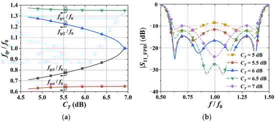 Meanwhile, Figure 5a shows the TPs varied with the coupling CT of a-line in the TCL, where CT = (Zea − Zoa)/(Zea + Zoa) [24]. It is seen that the in-band TPs change from four to three when the CT exceeds 6.925 dB. As illustrated in Figure 5b, wider bandwidth can be obtained with 10 dB return loss for CT = 5.5–6.5 dB. Wider impedance matching bandwidth with suitable TPs intervals is obtained when CT equals with 6 dB. Thus, Zea can be calculated as 150.3 Ω when Zoa is assigned as 50 Ω. Figure 6 shows the variations of TPs and |S11_FPD| along with the odd-mode impedance of b-line (Zob). Four TPs can be generated when Zob is larger than 35 Ω. But the |S11_FPD| bandwidth is less influenced by the Zob. Since the even-odd mode impedances of the edge and center lines in the TCL satisfy the relation in (4c), the even-mode impedance Zob of the b-line is calculated to be 156 Ω when Zob is selected as 60 Ω.