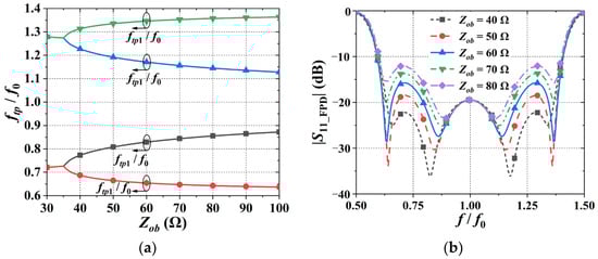 Calculated (a) TPs and (b) |S11_FPD| of the FPD with different Zob. (Z1 = 42 Ω, Z2 = 70 Ω, Ze = 172 Ω, Zo = 50 Ω, Zea = 150 Ω, Zoa = 50 Ω).