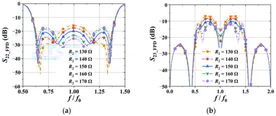 The remaining parameters are the isolated resistors R1 and R2, which contribute to the output ports matching and isolation. On the basis of the parameters obtained above, the relationship between R1 and R2 can be expressed by using the condition of S22_FPD = S23_FPD = 0, as shown in (10). Figure 7 shows the calculated |S22_FPD| and |S23_FPD| of the FPD as a different R2. It can be observed that as R2 increases, the |S22_FPD| and |S23_FPD| values around the center frequency are decreasing, while both of the values deteriorate near the side frequencies. Finally, under the criterion of |S22_FPD| and |S23_FPD| less than −20 dB, R2 is selected as 150 Ω. According to (10a), the value of R1 is calculated as 15 Ω.