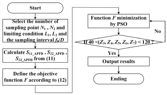 Here, the derivations of Ae_in, Be_in, Ce_in, De_in, and Ae(o)_out, Be(o)_out, Ce(o)_out, De(o)_out in (11) and (12) are shown in Appendix A. According to (11a), the parameters of the absorptive branches can be derived when assigning the absorptive criterion (for example, |S11_AFPD| < −10 dB). Since there are seven unknowns (Z3, Z4, Z5, Z6, Z7, R3, R4) in the absorptive branches, the particle swarm optimization algorithm (PSO) is used for fast computation. Equation (13) lists the defined objective function F. Here, N1 and N2 are the sampling points numbers in the absorptive and filtering bands, respectively. fi is the sample frequency, where the sample interval is f0/D. It is noted that in the function F, g1 is denoted as more than 10 dB at the input absorptive band, which corresponds to L1 = 10 dB. In addition, to guarantee non-deterioration on other performances (output port impedance matching and isolation), the criteria g2 and g3 are added. In (13c) and (13d), the L2 represents the limiting conditions of output port impedance matching and isolation, which equals 20 dB.