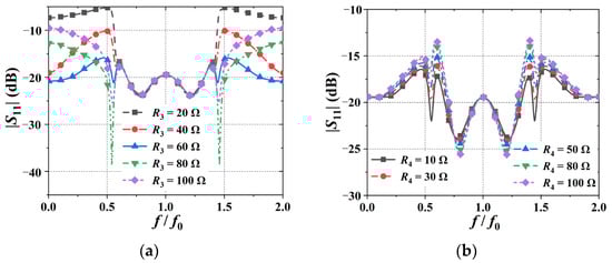 Figure 10 shows the effects of the resistors R3 and R4 on |S11| of the AFPD. It is seen that the out-of-band absorptive feature is mainly influenced by R3. As R3 increases within 20–60 Ω, the out-of-band return loss is increased. When R3 continues to increase from 60 Ω to 100 Ω, the 10 dB absorptive bandwidth is nearly unchanged, only the matching degree is influenced. As can be seen in Figure 10b, the changing of R4 will affect the matching degree of the input port, but the 10 dB absorptive bandwidth is nearly unchanged.
