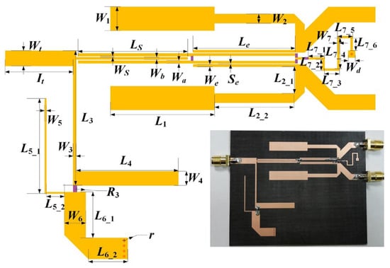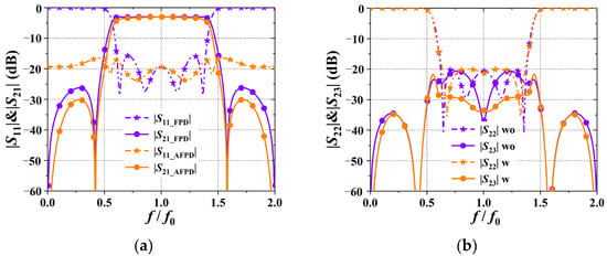Table 1 displays the calculated circuit parameters of the AFPD. Based on Table 1, the performance of the AFPD is obtained and listed in Figure 11. For convenience, the S-parameters of FPD and AFPD are compared directly. It is observed from Figure 11a that by inserting the absorptive branches, the bandwidth for 15 dB return loss at the input port is increased from 79% (0.61 f0–1.40 f0) to 200% (0–2 f0). In addition, the out-of-band suppression has been enhanced to over 30 dB. Under the criterion of |S21| = −6 dB, the calculated bandpass bandwidth is 85%, and the RC (|BW20dB/BW3dB|) reaches 1.17. Figure 11b indicates that the output port impedance matching is less affected by the absorptive branches. But the isolation between output ports is enhanced in the filtering band. After inserting the absorptive branches, the calculated |S23| is less than 21 dB from 0–2 f0, while the |S22| is less than −15 dB from 0.61 f0 to 1.39 f0, yielding a bandwidth of 78%.