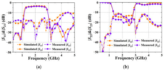The simulated and measured results of the fabricated AFPD. (a) |S11| and |S21|, (b) |S22| and |S23|.