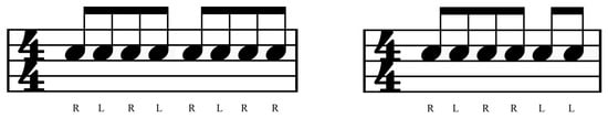In 1933, drummers in the United States organized a meeting to discuss drum instruction. Considering control, coordination, and endurance, thirteen rudiments were selected and deemed essential for any drummer to know [13]. They remain an important part of the musical language of drumming in most contexts and cultures, regardless of genre. They also remain staples in most drummers’ practice routines, as complete mastery of a rudiment is never fully achieved. The speed, clarity, and technique involved in the performance of a rudiment can be improved endlessly. While some rudiments have rhythmic dynamics, others, such as those shown in Figure 1, focus on sticking or the specific assignment of notes to the left or right hand. These exercises build coordination and help players play specific accent patterns or phrases smoothly.