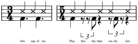 Alternative methods for polyrhythmic learning involves metric patterns in language [18]. For example, the phrase “hot cup of tea” can rhythmically represent the 3:2 polyrhythm as in the first example of Figure 2; “what atrocious weather” can represent the 3:4 polyrhythm; “I’m looking for a home to buy” can represent the 5:4 polyrhythm [19]. Figure 2 shows compatible phrases below the two written polyrhythms. However, these too are limited as there does not exist a helpful mnemonic phrase for every m:n polyrhythm.
