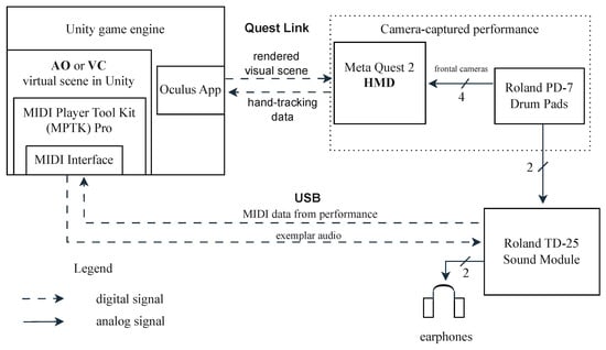 We developed a system to explore ao- and vc-informed drumming pedagogy. Our system uses a Roland TD-25 Drum Sound Module sensing user performance on Roland PD-7 electronic drum pads, the integrated sensors on the Meta Quest 2 head-mounted display (hmd), and a workstation or laptop computer running the Unity 2023.1.0b6 game engine. The components and connections are shown in Figure 3. Each PD-7 dual-trigger drum pad is a 7.5″ rubber pad with two piezo-electric transducers embedded in the pad’s rim and center [40]. When a pad is struck in either area, an analog, impulse-like signal is output via a stereo 1/4″ cable to the sound module via the trigger input.