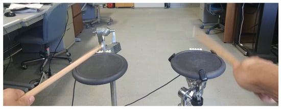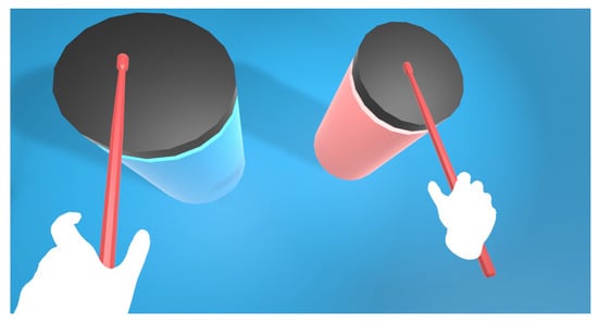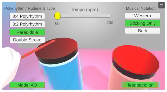 In the ao scene, the user wears an hmd and experiences a virtual scene while drumming, as shown in Figure 4. The user is expected to drum in-sync with the exemplar sticks of the virtual scene as the concurrent feedback is conveyed. Because of the lack of SoA, it is expected that this virtual scene is not as beneficial as a vc-based scene, but it is predicted to be more effective than a video. The ao scene may not be optimized for the cognitive phase of learning, but it could excel in the associative and autonomous phases.The user’s point of view of the virtual scene set up for ao practice can be seen in Figure 5.