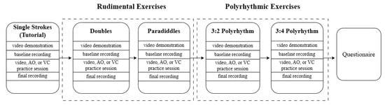 There were 15 subjects (12 male, 3 female), students recruited from the university, who participated in the pilot study (age: . Before the start of the experiment, subjects self-reported their age, dominant hand, whether or not they were able to read Western musical notation, musical experience, and primary and secondary instruments (where applicable). Of these, 86% were right-handed, 40% had some prior experience with musical instrument practice, and 20% were currently active performing members of university music clubs. Subjects were randomly assigned to one of three groups corresponding to three modalities they were to use when practicing two rudiments and two polyrhythms throughout the experimental procedure, as shown in Figure 6. The group assignments (Video, ao, and vc) came into effect during the practice session phase of each section (tutorial, rudimental, polyrhythmic) of the experiment. Subjects were given information and instructions via a script read aloud before they were given an informed consent form to sign. The experiment then proceeded from the tutorial.