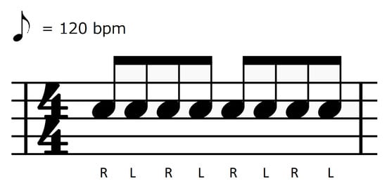 All subjects first completed a four-phase introductory tutorial to help familiarize themselves with the flow of the experiment and their assigned system. Subjects were told that they could ask questions or adjust the height of the seat and drums any time throughout this tutorial. Simple single-stroke eighth notes were used as the tutorial’s lesson, as shown in Figure 7.