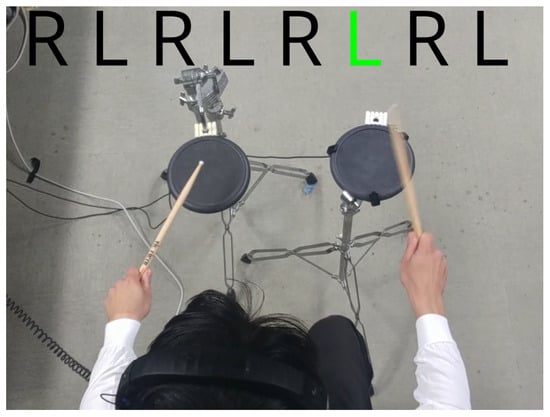 The first phase of the tutorial consisted of showing a video demonstration to the subject via a computer monitor and stereo loudspeakers. The video was a performance of single-stroke eighth notes filmed with an overhead camera placed behind a drummer, as shown in Figure 8. The video started with a metronome for one measure before the demonstration of the exercise began. The exercise was played for four measures, a 22 s video in total. The audio of the performance in the video was quantized and panned, to rectify timing imprecision and to achieve stereo separation, respectively.