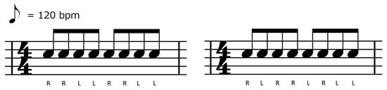 After the tutorial, subjects were asked to complete the same four-phase procedure for four musical exercises, the first two of which were rudiments, specifically doubles and paradiddles, shown in Figure 9. Rudiments were chosen as they are the building blocks of drumming, practiced by players of all levels. Beginners may practice them slowly to learn the sticking, while advanced players may practice them at challenging tempos or with heightened focus on timing accuracy.