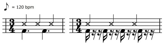 A polyrhythm is “a set of simultaneous rhythms, where each rhythm strongly implies an entirely different meter” [14]. In other words, it is the simultaneous use of mathematically related divisions of pulse in music. For example, fitting a group of three notes in the same amount of time as another musical line fitting two notes creates a 3:2 polyrhythm. More generally, a musical phrase with m subdivisions played at the same time as a musical phrase with n subdivisions (where and n, m, and x are whole numbers) results in a m:n polyrhythm. Although polyrhythms are often written as different subdivisions of the same tempo when scored or transcribed using Western notation, as shown in Figure 2, polyrhythms can also be thought of as rhythms played in different, but mathematically related tempos.