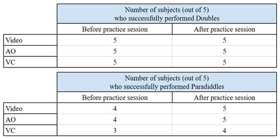 Some of the students within the ao and vc groups did not directly view or interact with the drum stick animations in the practice session. Instead, they were entirely focused on the dynamic sticking charts in front of the drums. Although these were deliberately placed in the vr scene such that both could be viewed simultaneously and subjects were instructed to focus on the movement of the animated sticks, some students left the moving sticks mostly out of their field of view. In previous ao and vc studies, allowing the subjects to clearly see such movements has been correlated with successful results [24,28]; so it is possible that this unanticipated complication had an effect on the ao and vc results in this pilot study.
