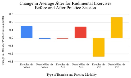 This development was successful in creating a tool for rhythmic pedagogy that incorporates both ao and vc techniques. The pilot study, while successful in some respects, did not show promising results in others. The vc group achieved a significantly higher novelty score on the UEQ survey relative to the Video group, but received a lower score in the efficiency category. Similarly, the average jitter results for subjects using vc to practice doubles showed drastic improvement compared to the other groups, but also a significant increase in average jitter relative to the other groups after practicing paradiddles. The vc condition taught a paradiddle to one of two subjects who could not successfully perform the rudiment prior to the practice session, whereas the other two conditions taught one out of one subject.