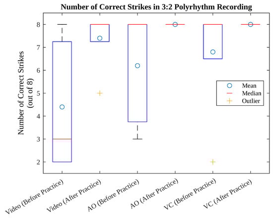 Comparison of successful strikes in 3:2 polyrhythm performance before and after practice session for Video, AO, and VC groups.